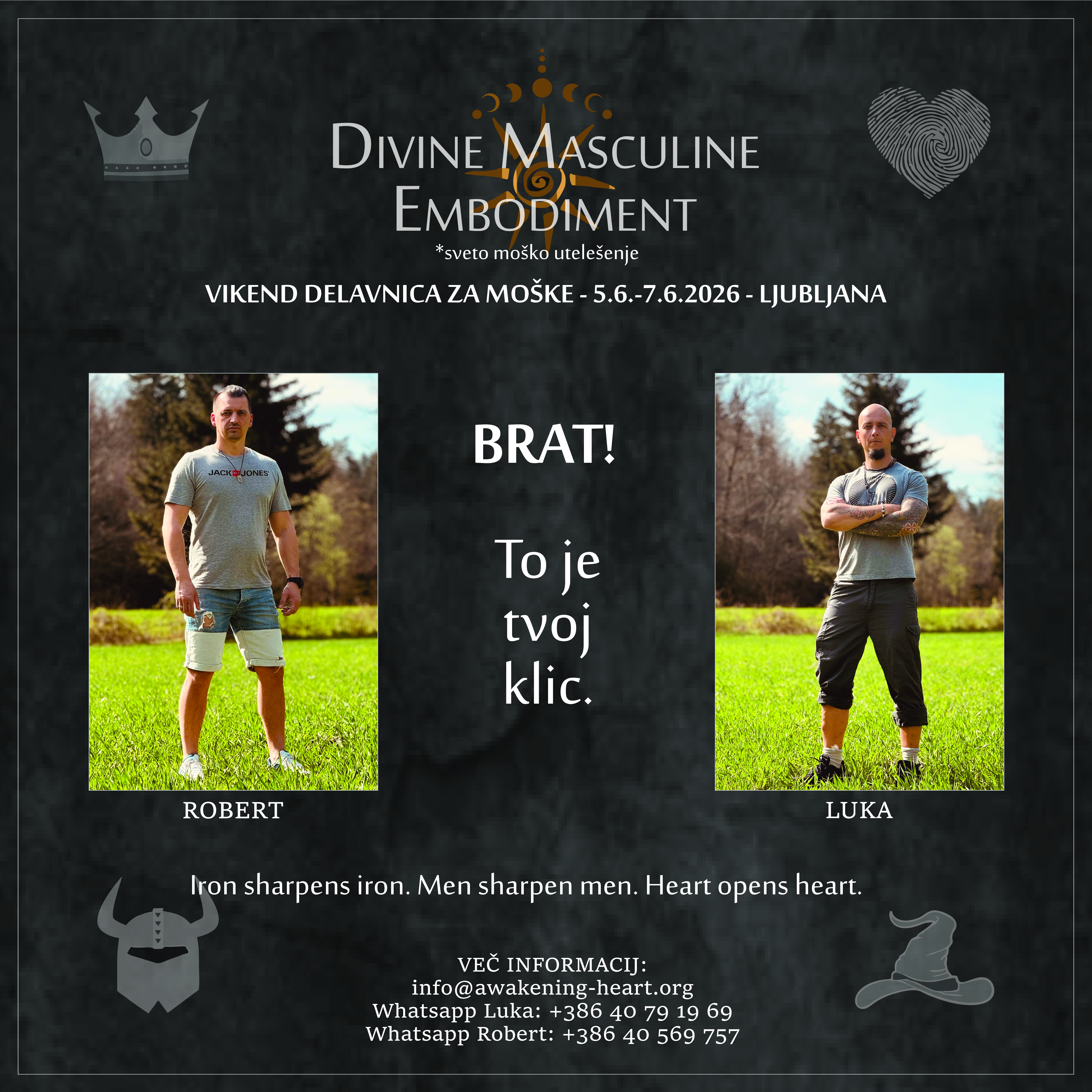 Vabiva te na vikend poglobljeno izkustveno delavnico za moške, namenjeno utelešanju zrele, odgovorne in srčne moškosti skozi štiri temeljne arhetipe: Bojevnika, Čarovnika, Kralja in Srca.