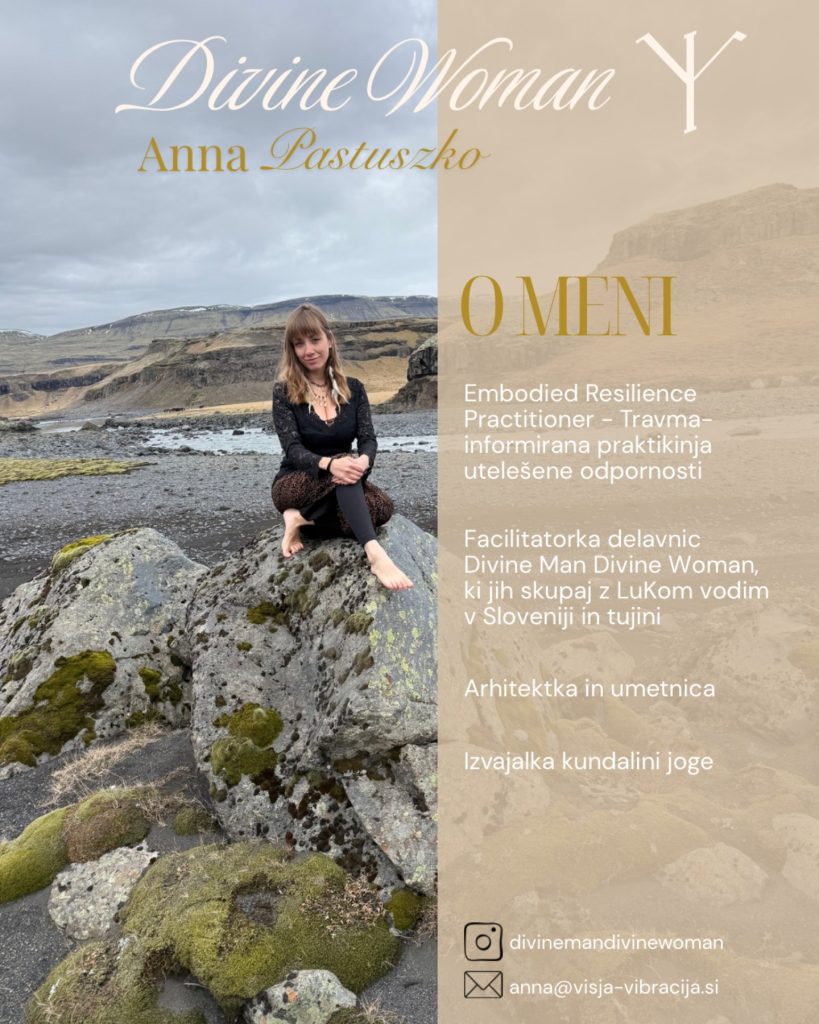 Anna Pastuszko- Embodied Resilience Practitioner- Travma informirana praktikinja utelešene odpornosti; Facilitatorka delavnic Divine Man Divine Woman, ki jih skupaj z LuKom vodim v Sloveniji in tujini; arhitektka in umetnica; izvajalka kundalini joge.