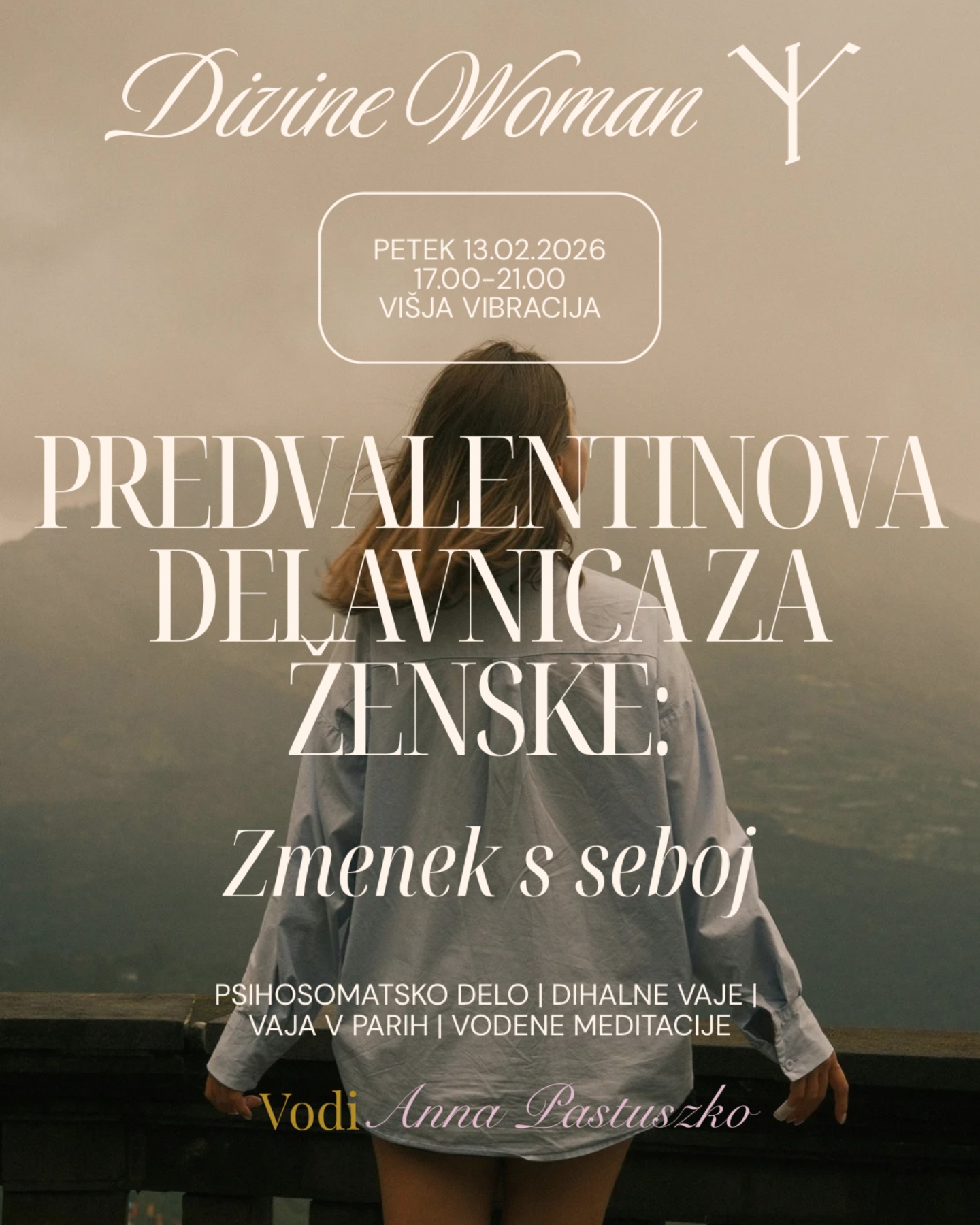 Če imaš ravno prosto popoldne in si želiš zmenka sama s seboj, te vabim na to žensko srečanje. Obleci se v tisto, v čemer se počutiš najbolje in najbolj udobno, s seboj pa prinesi bidon za vodo in masko oz. prevezo za oči.
